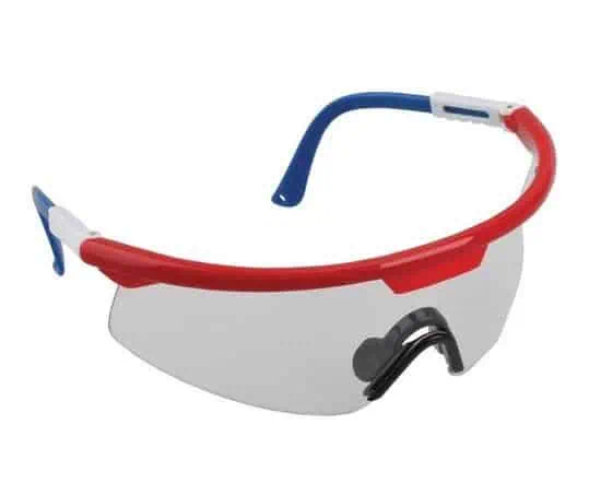 A: The Gladiator Safety Glasses are available with either a black frame or a red/white/blue frame.